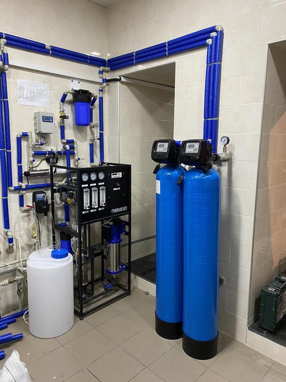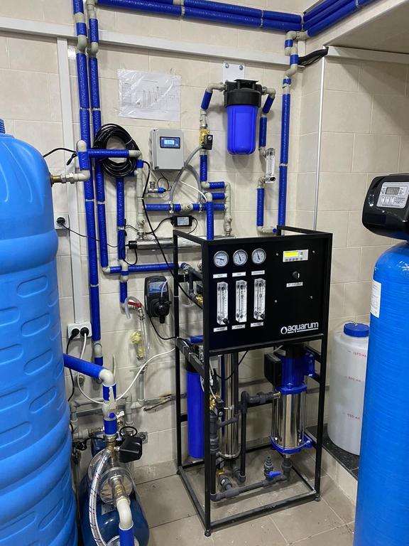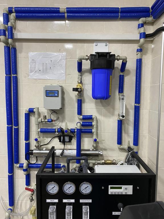 Подготовка воды для производства пива. Применена схема очистки воды на основе обратного осмоса с подмесом воды для достижения определенного содержания солей в подготовленной воде. Подмес воды осуществляется после очистки на механическом, угольном фильтрах и УФ-системе обеззараживания. Степень подмеса регулируется при помощи кондуктометра и ротаметра в ручном режиме.